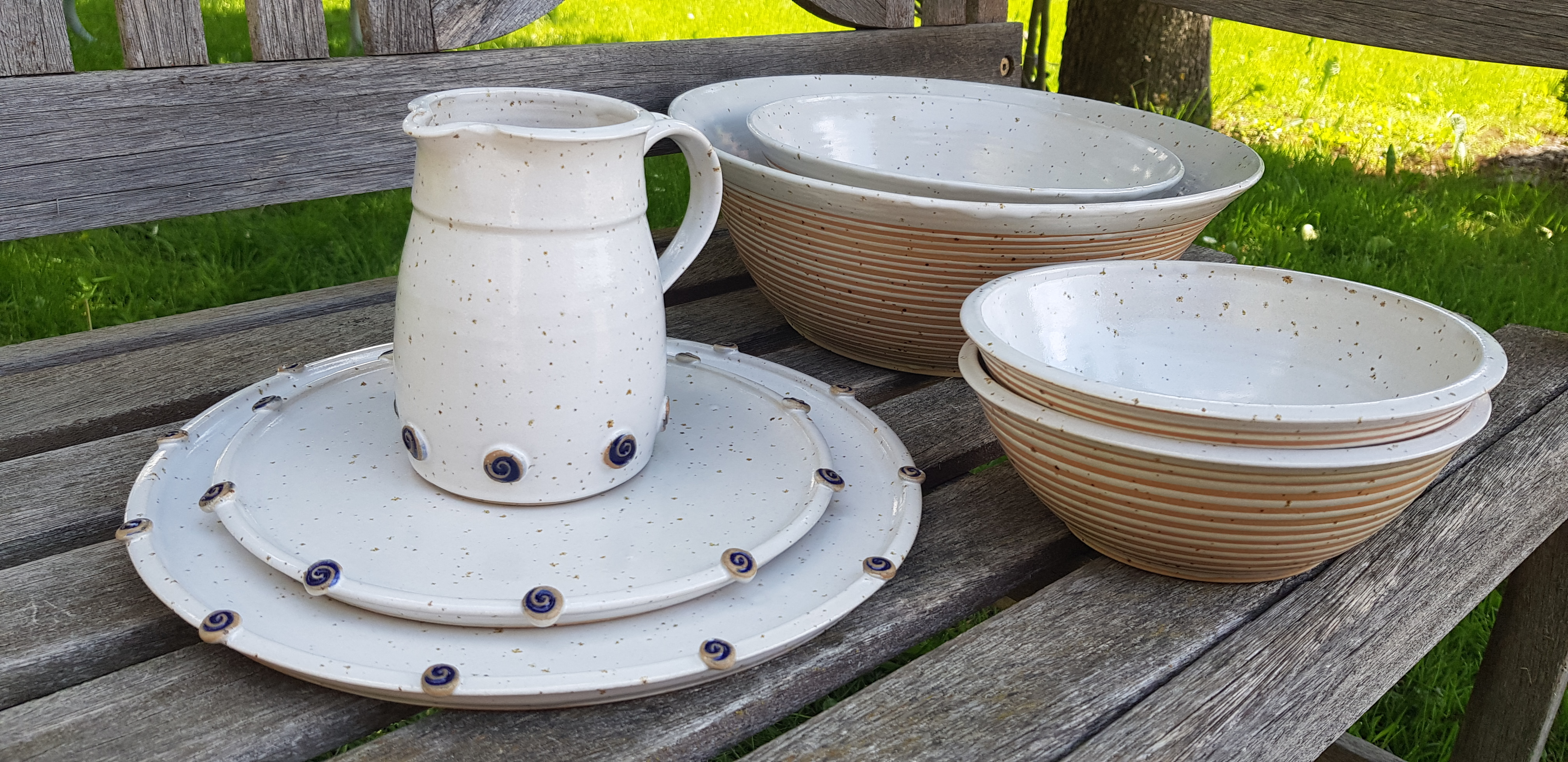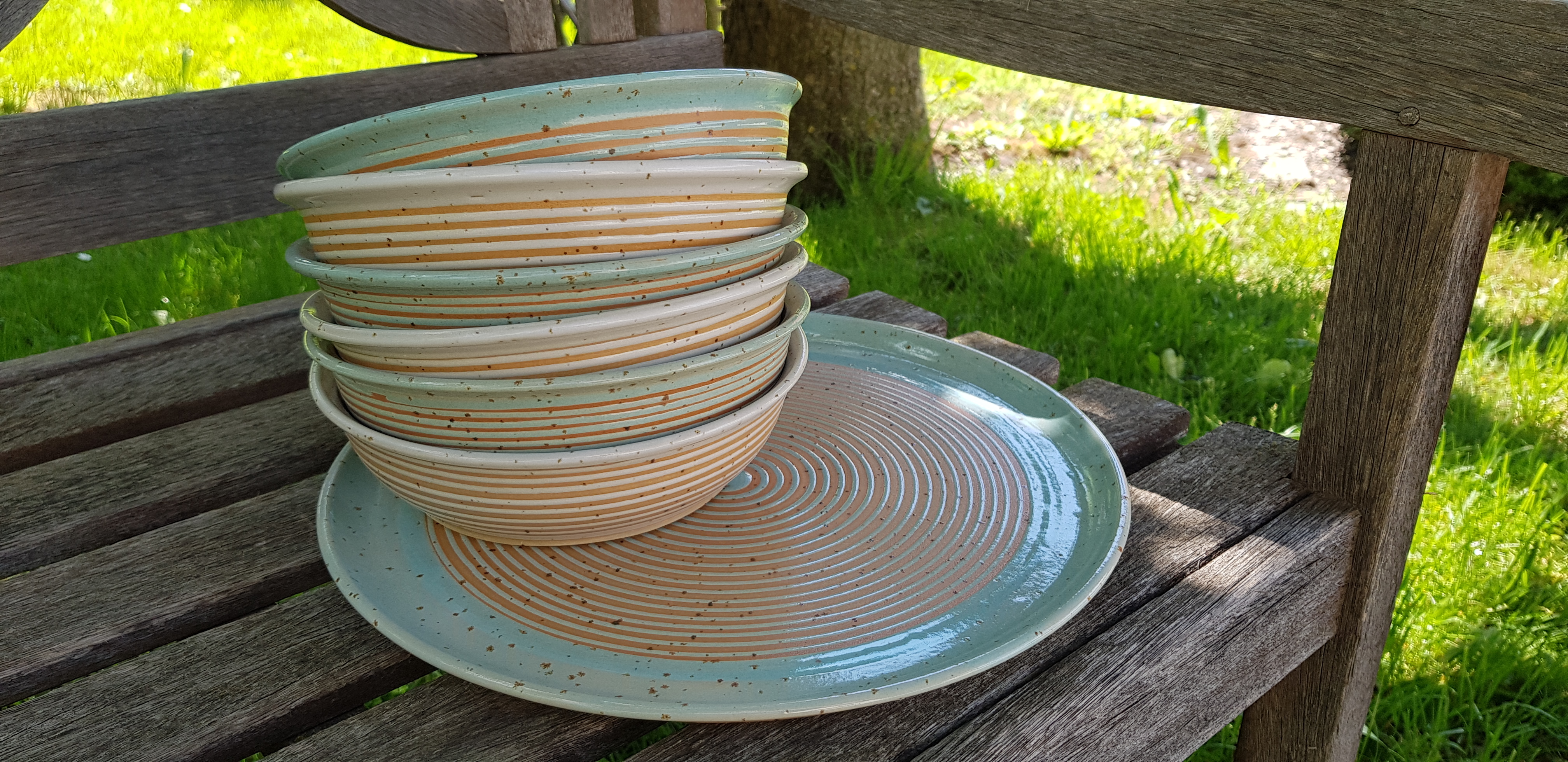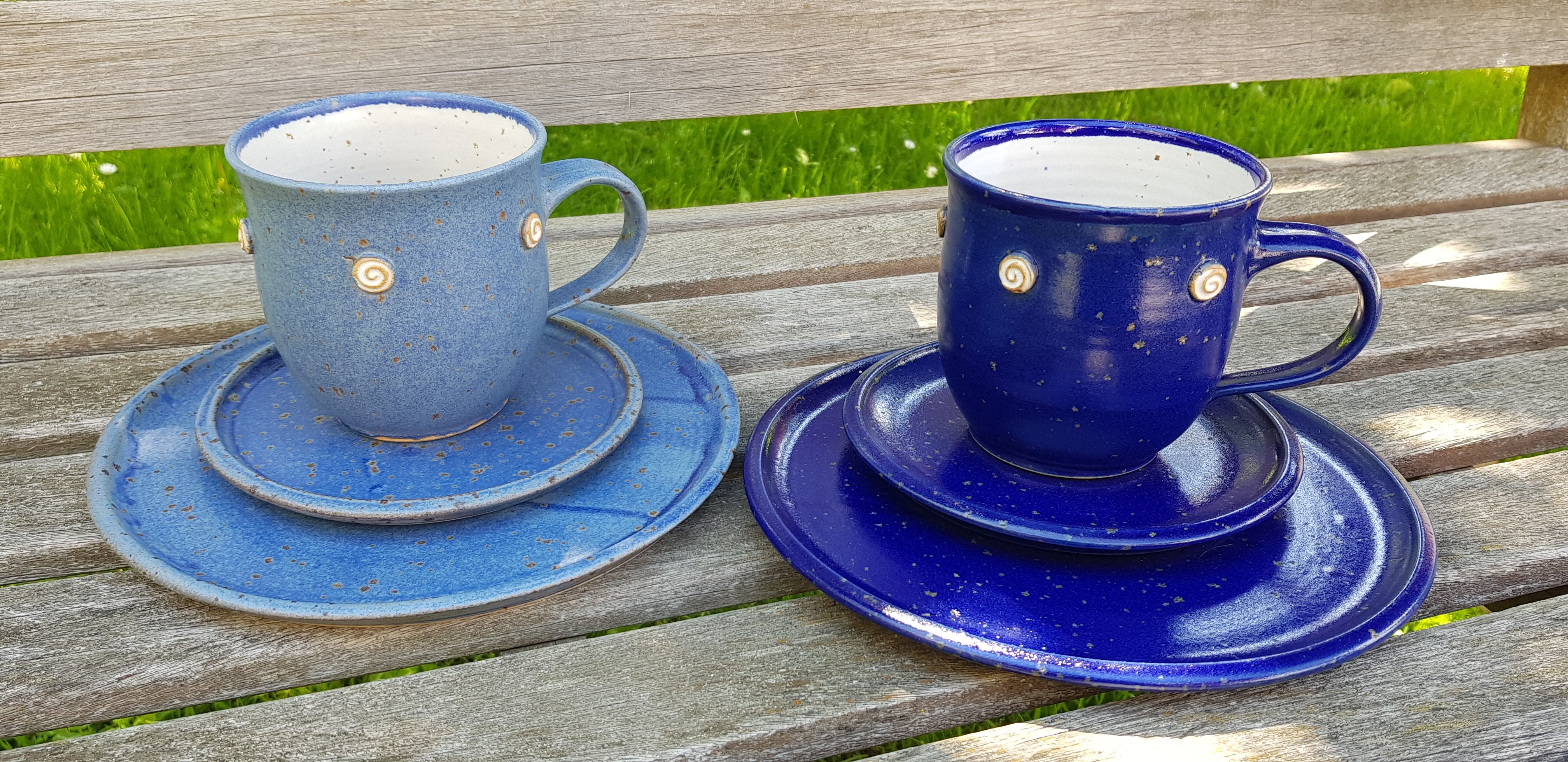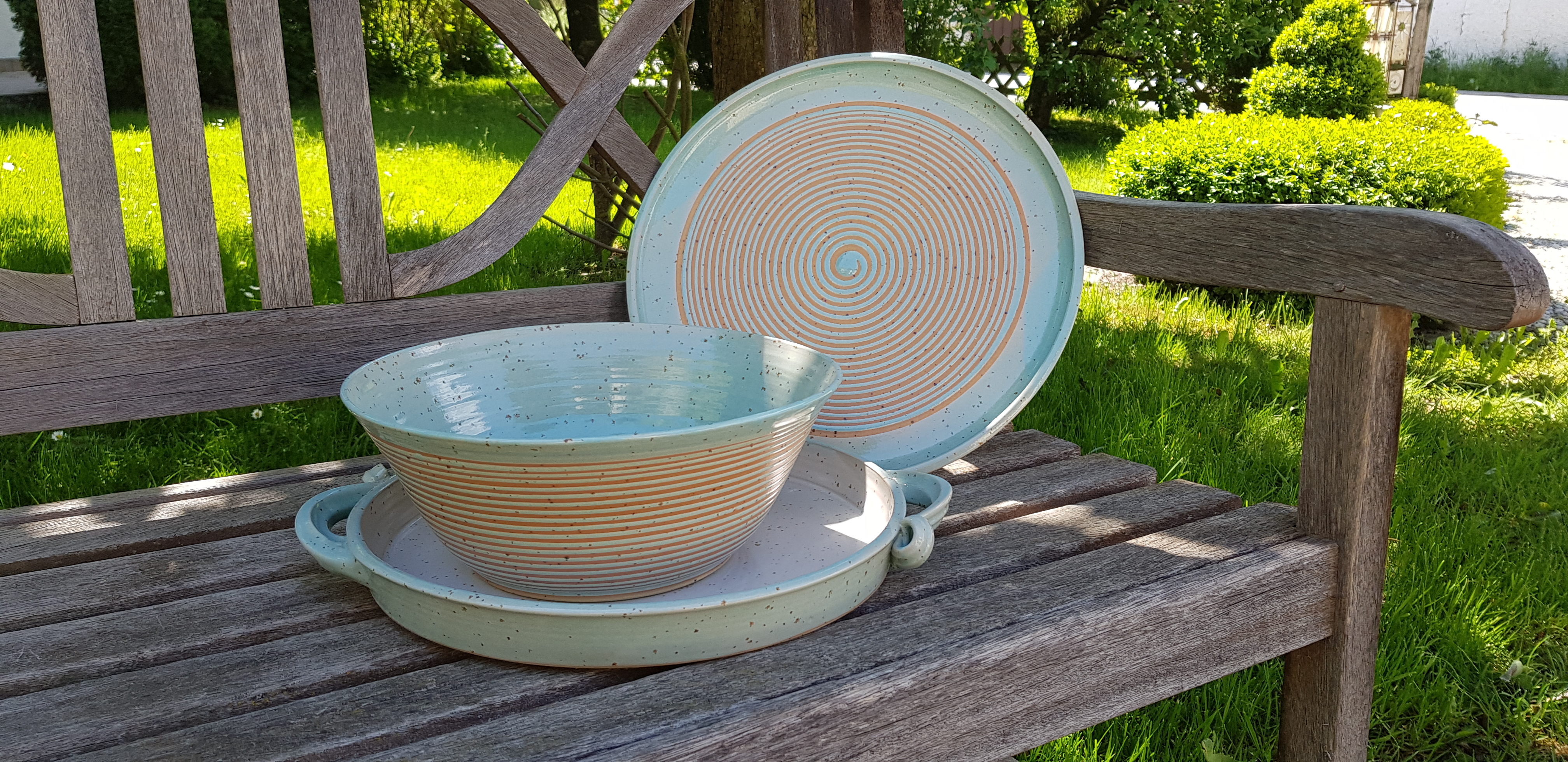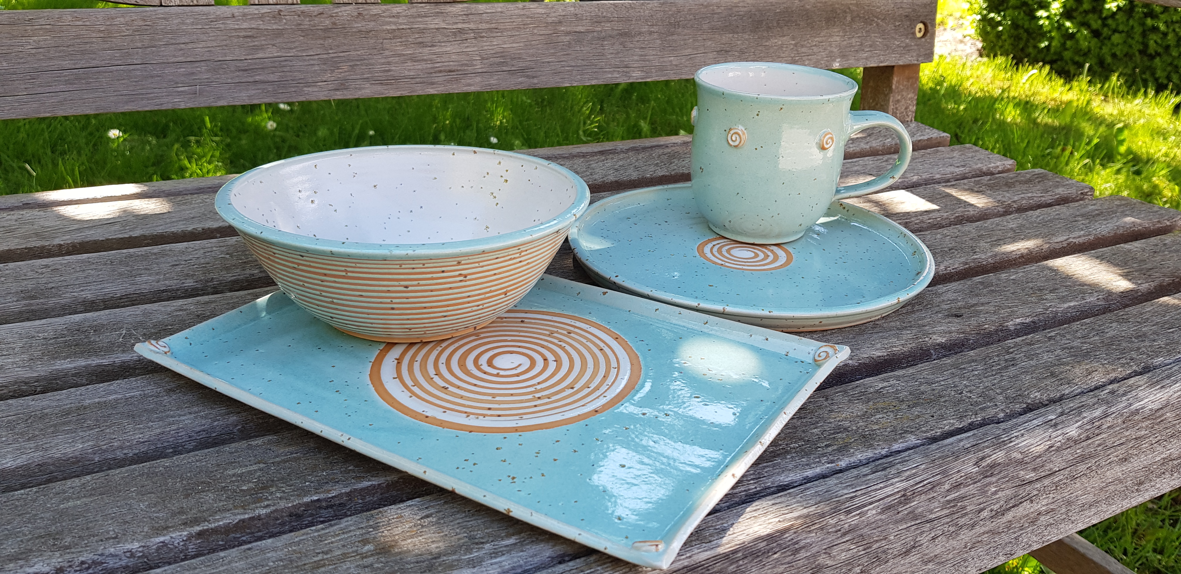 Mein Geschirr ist aus Steinzeugton auf der Töpferscheibe dünn gedreht, hoch gebrannt bei 1250 °C, somit ist es spülmaschinen- und mikrowellenfest und für den Backofen geeignet