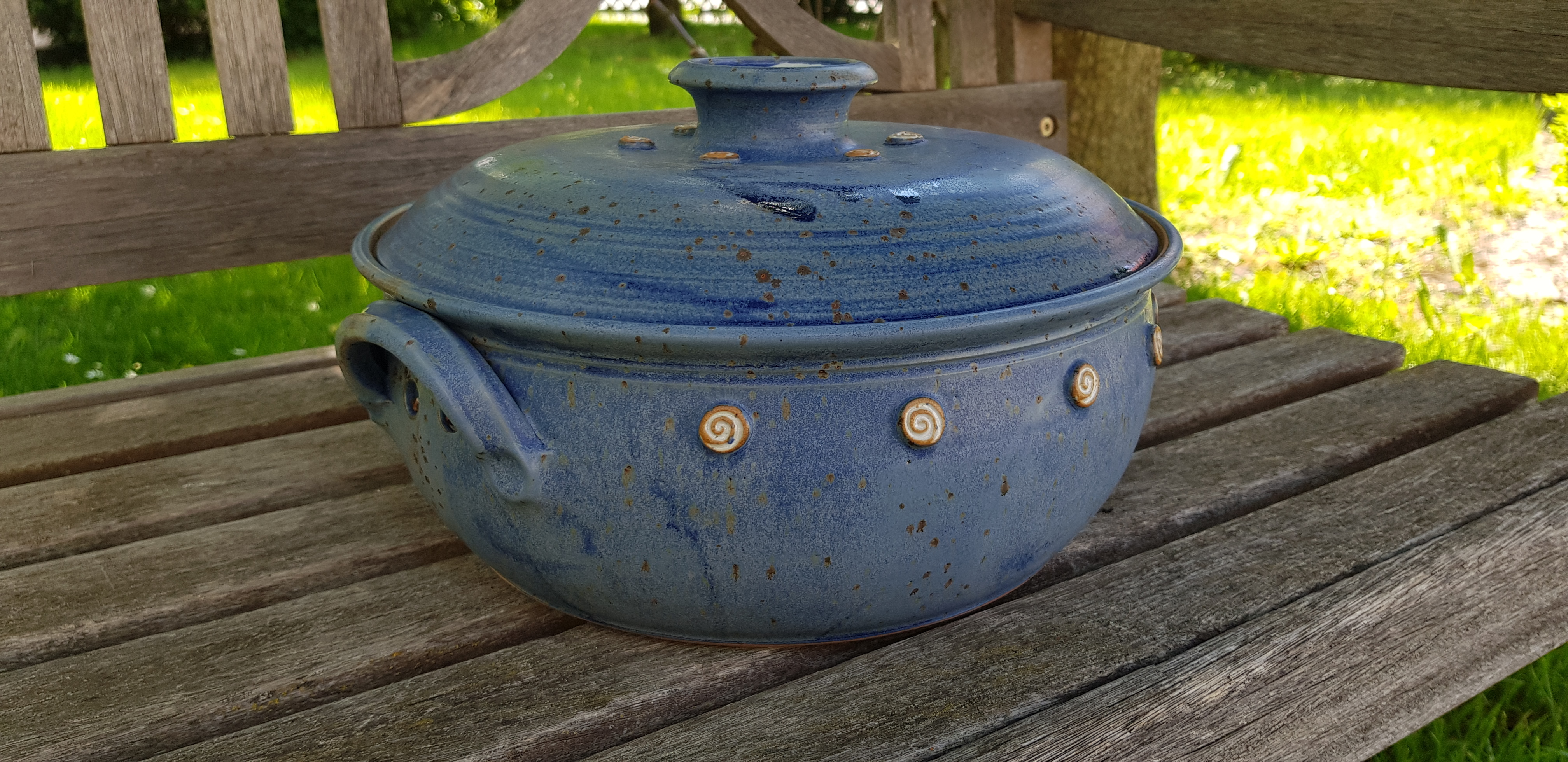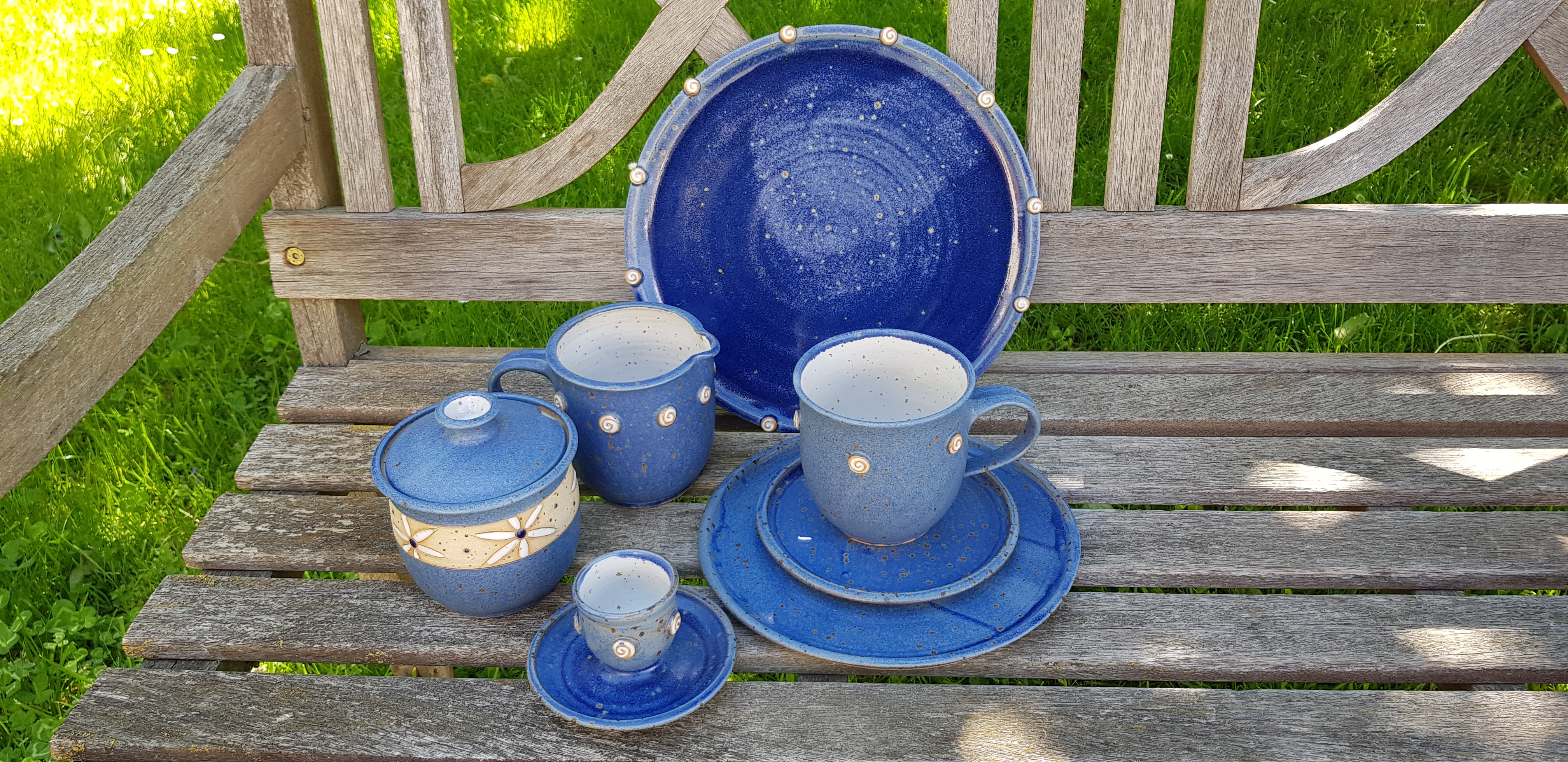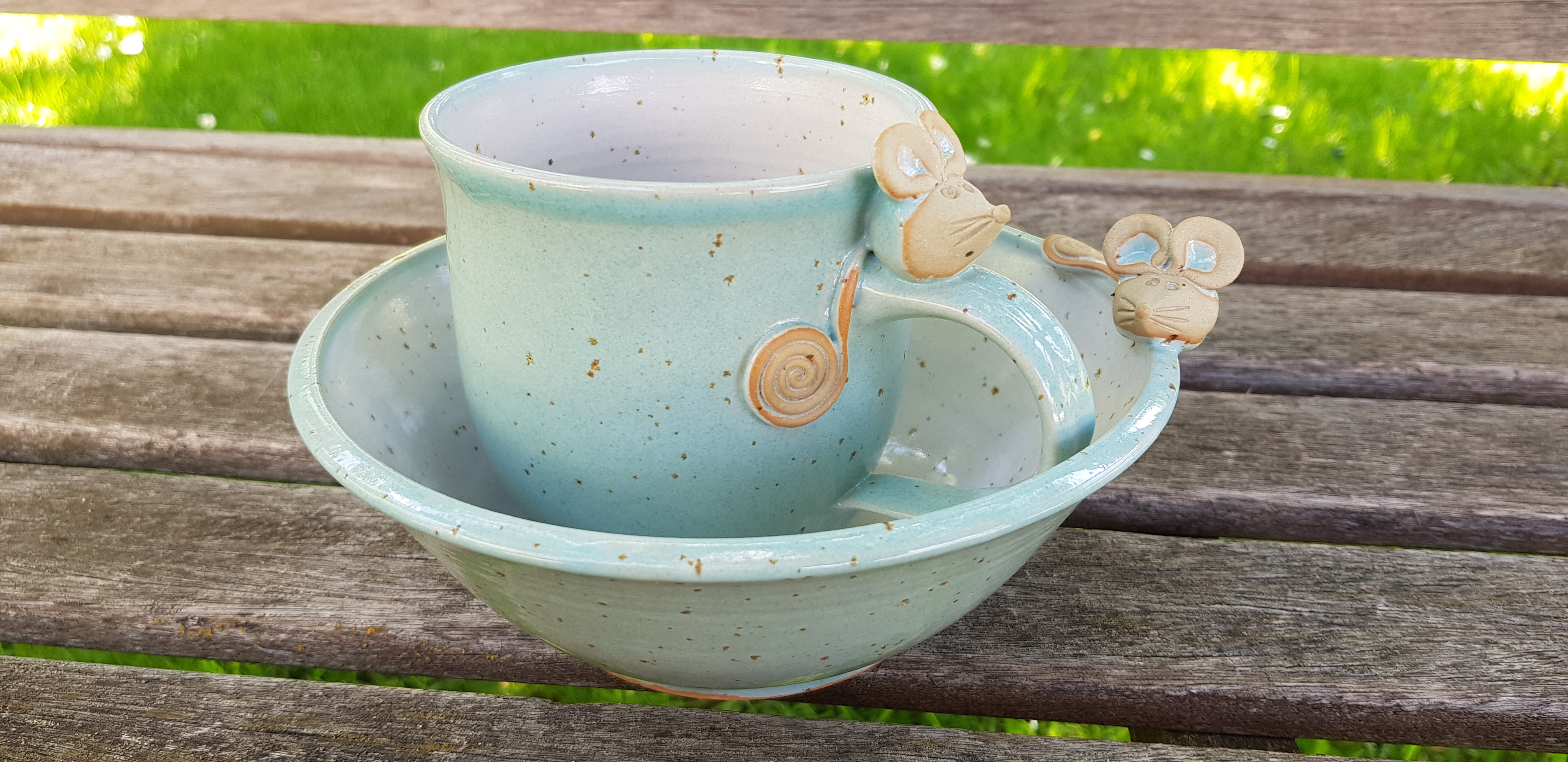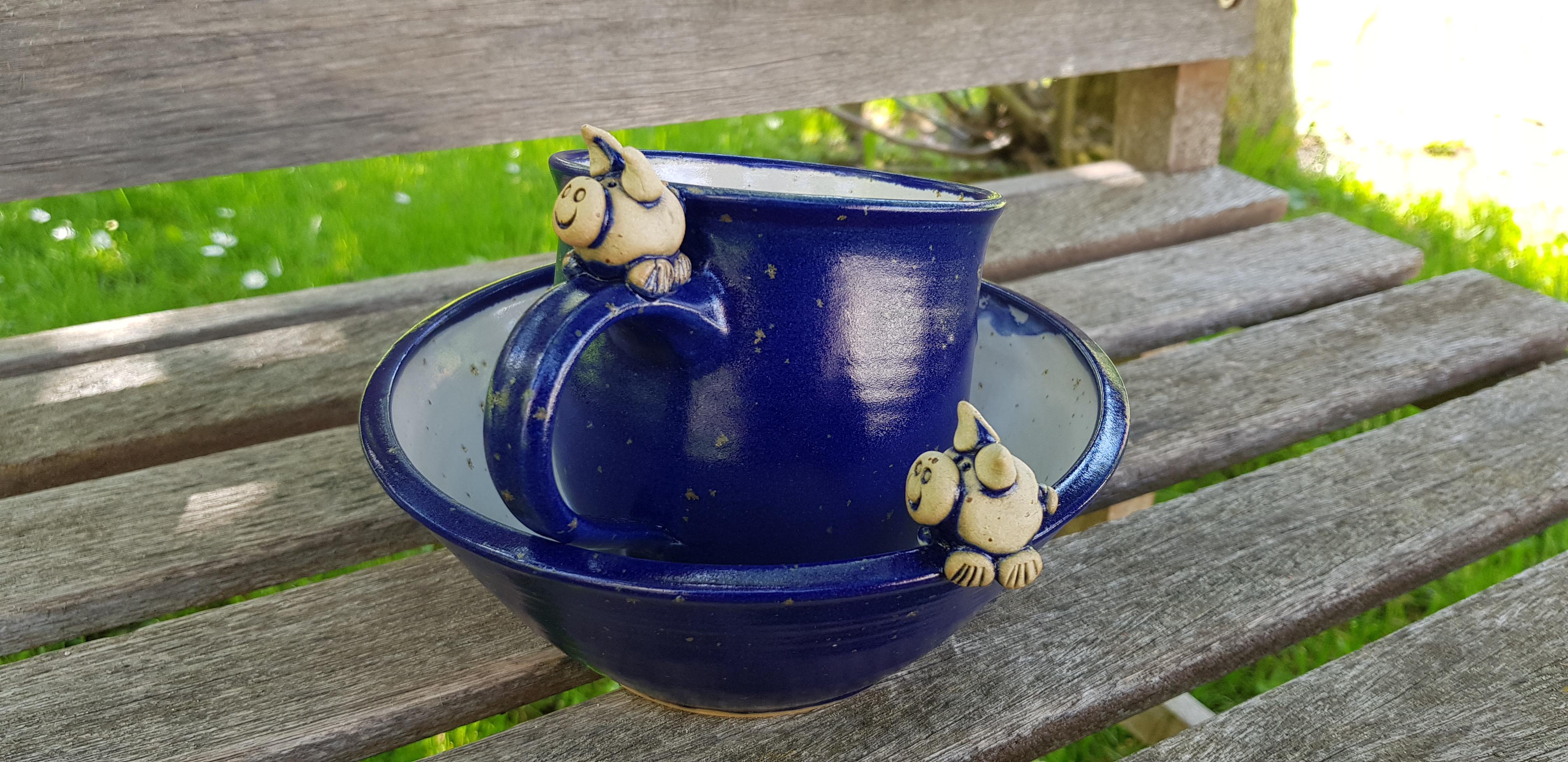 Mein Geschirr ist aus Steinzeugton auf der Töpferscheibe dünn gedreht, hoch gebrannt bei 1250 °C, somit ist es spülmaschinen- und mikrowellenfest und für den Backofen geeignet