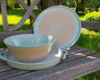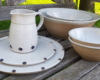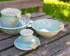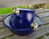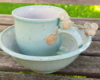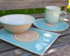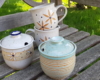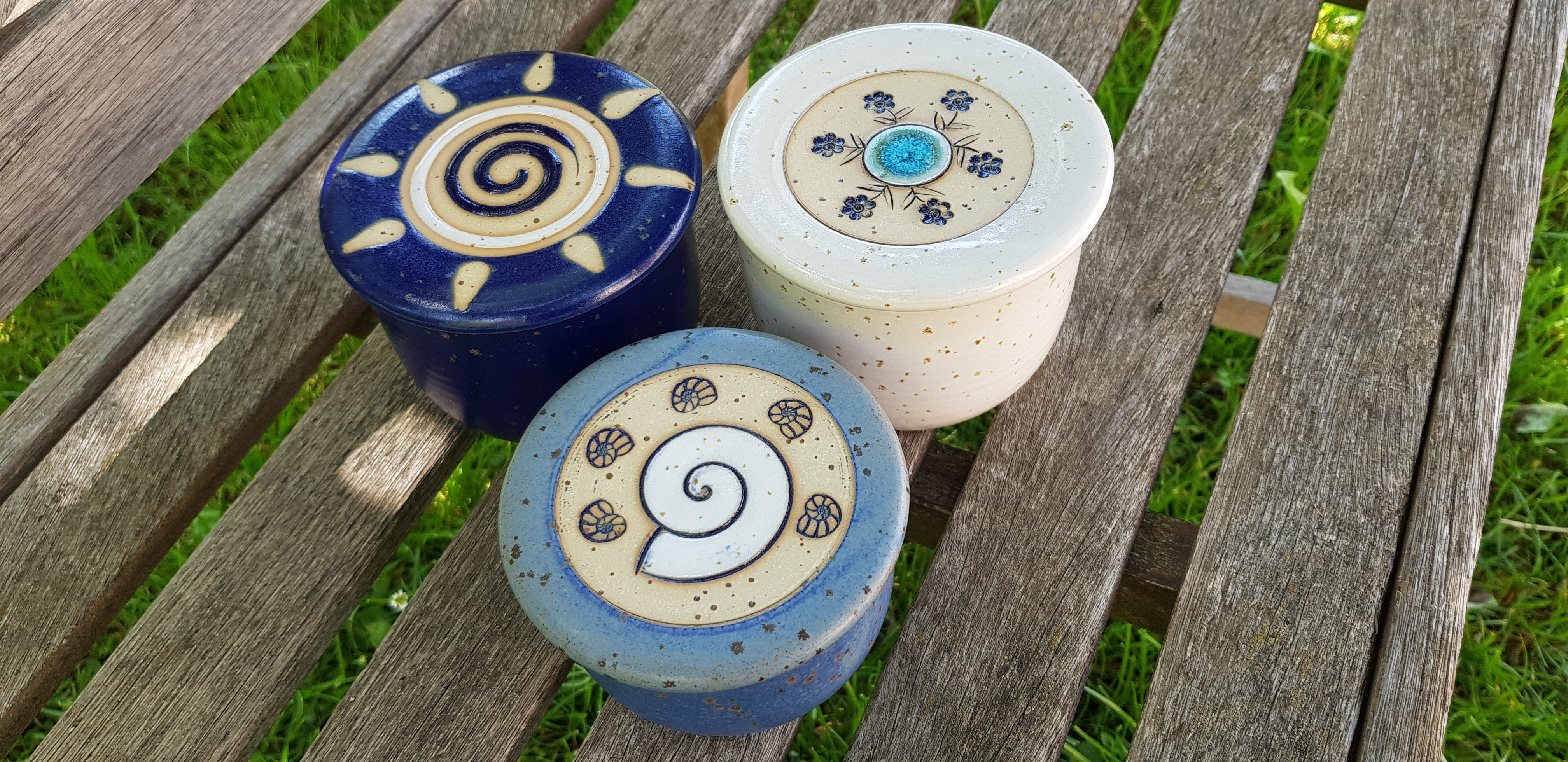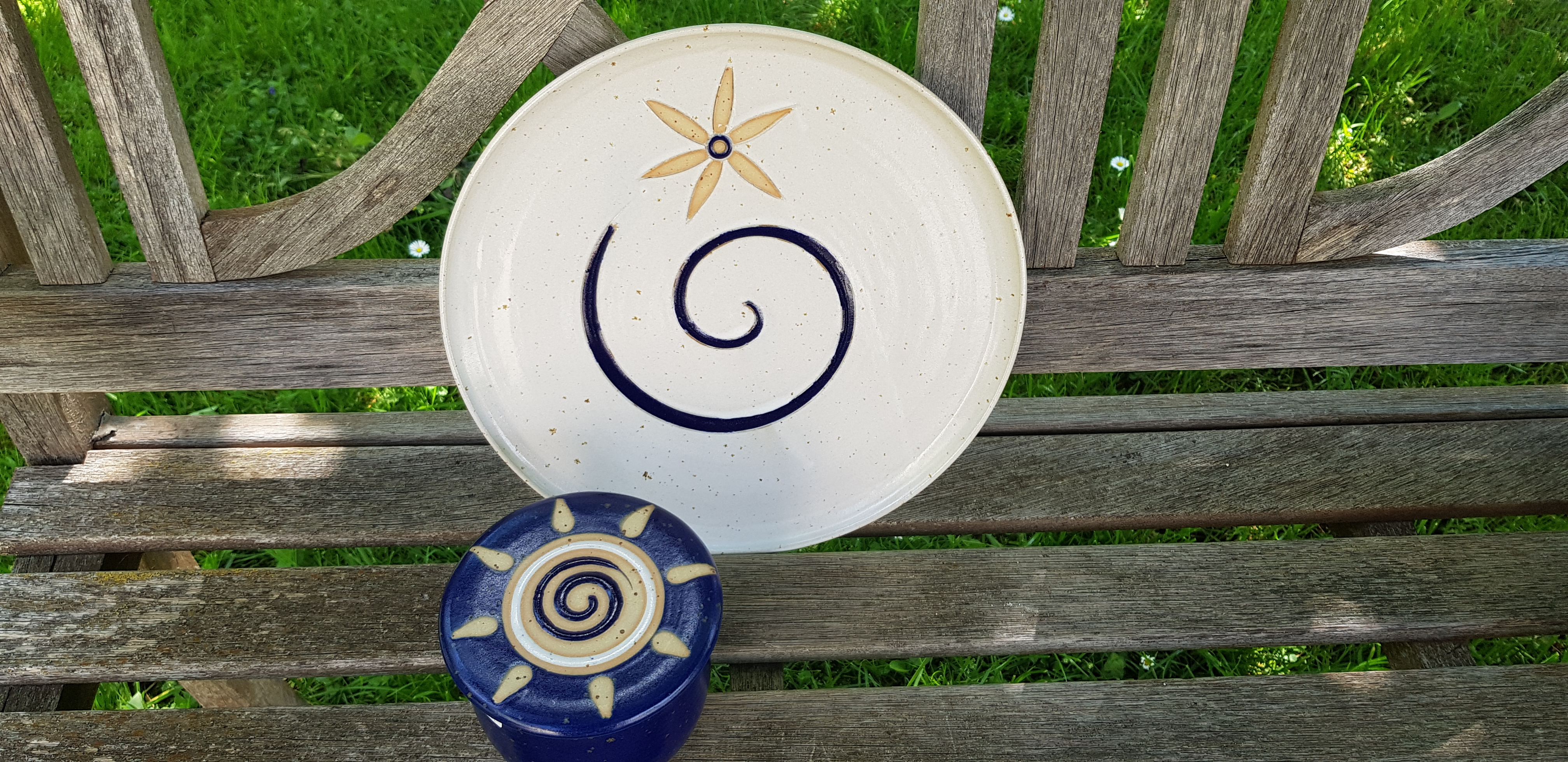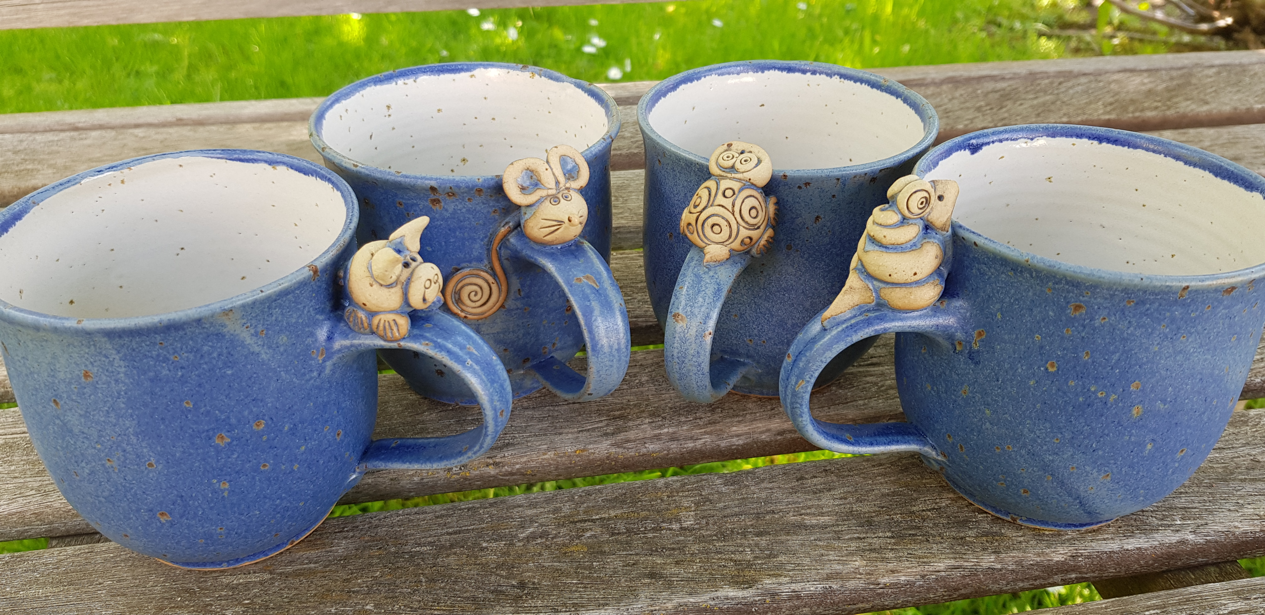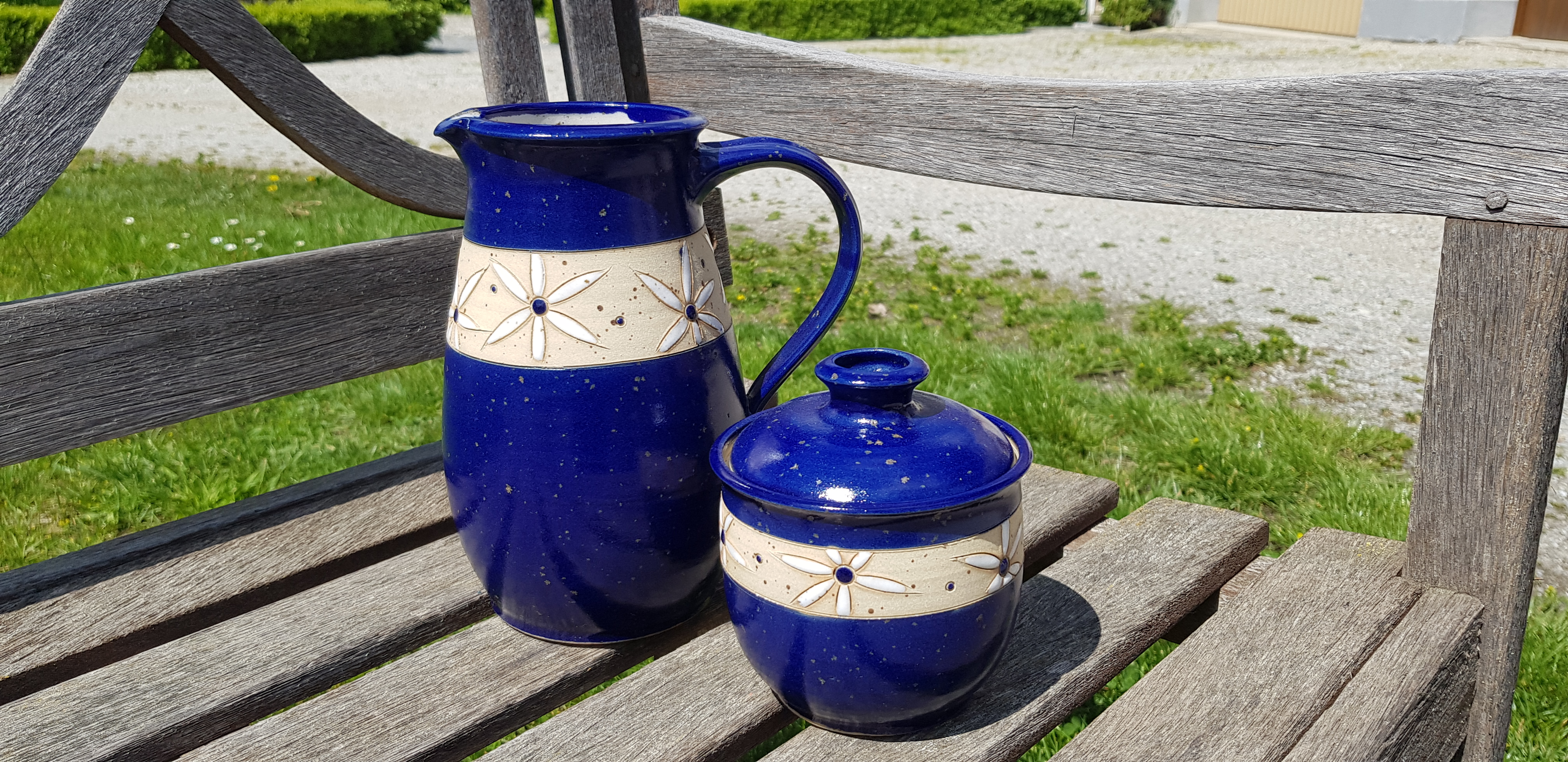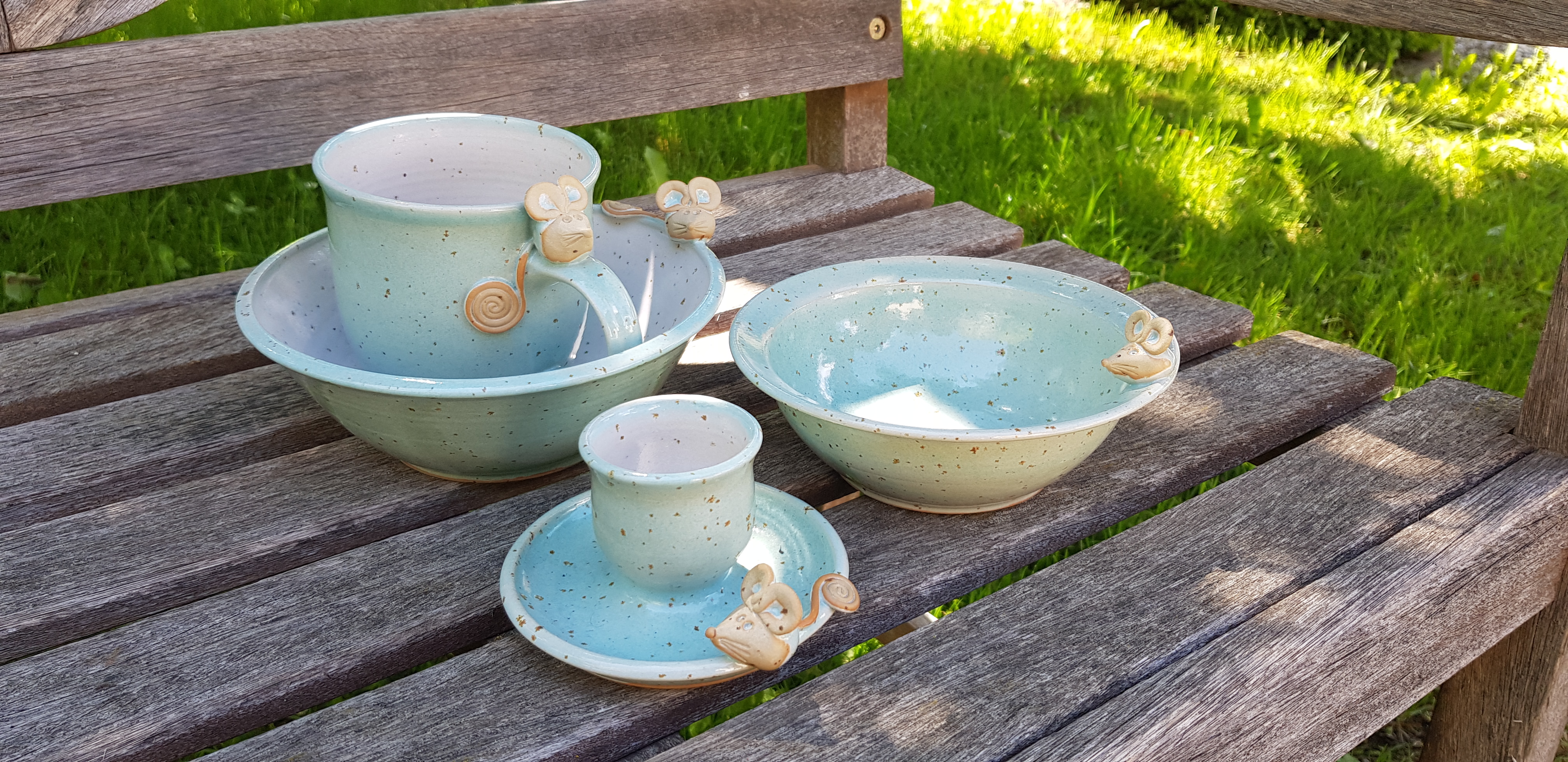 Mein Geschirr ist aus Steinzeugton auf der Töpferscheibe dünn gedreht, hoch gebrannt bei 1250 °C, somit ist es spülmaschinen- und mikrowellenfest und für den Backofen geeignet
